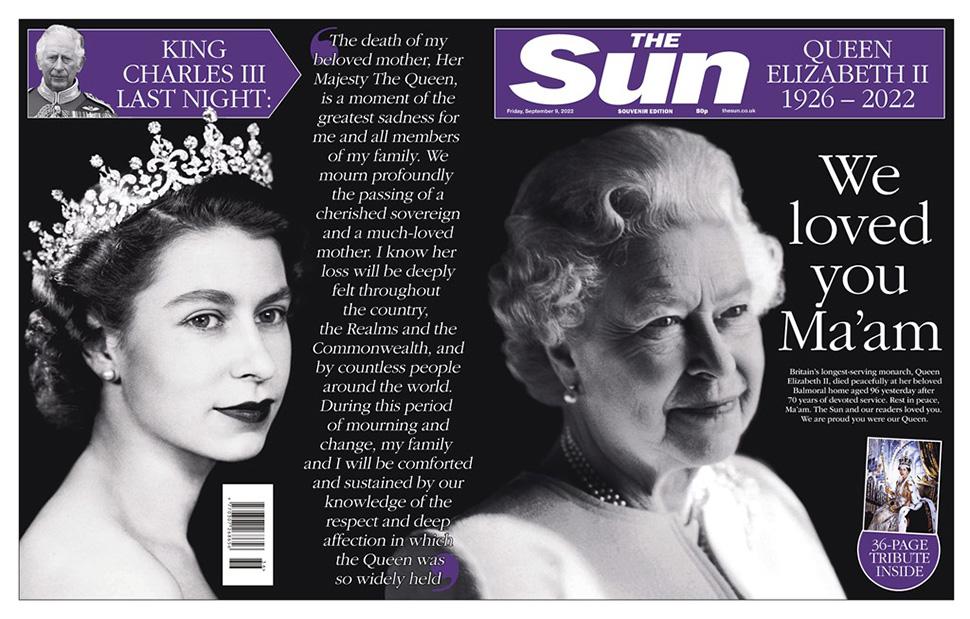 Σύσσωμος ο Τύπος της Βρετανίας, όπως είναι φυσικό, προβάλλει σχεδόν αποκλειστικά στα πρωτοσέλιδά του την Παρασκευή την είδηση του θανάτου της βασίλισσας Ελισάβετ.