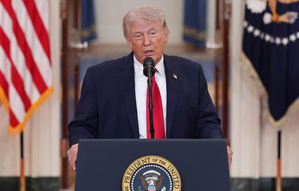 Στεκόμενος στην ίδια είσοδο όπου μίλησε το 2020 μετά τη δολοφονία του Κασέμ Σουλεϊμανί, διοικητή του Σώματος των Φρουρών της Ισλαμικής Επανάστασης του Ιράν, ο Τραμπ δήλωσε ότι οι πρόσφατες επιθέσεις έχουν εξαλείψει την ηγεσία της χώρας, ανοίγοντας τον δρόμο για συζητήσεις με μια «λιγότερο ριζοσπαστική» και «πιο λογική» νέα ομάδα ηγετών. Αλλά εάν το Ιράν δεν καταλήξει σε συμφωνία με τις ΗΠΑ, ο Τραμπ δεσμεύτηκε να εξαπολύσει επιθέσεις στους σταθμούς παραγωγής ενέργειας της χώρας.