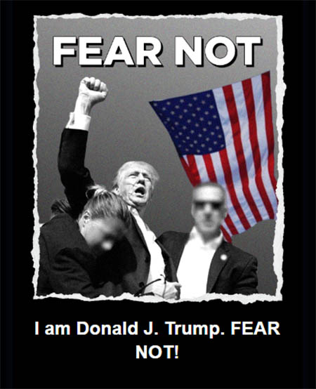 Δείχνει τη γραμμή αίματος στο πρόσωπο του Ρεπουμπλικάνου υποψηφίου και την υψωμένη γροθιά του σε ένδειξη πείσματος αφότου μία σφαίρα διαπέρασε το πάνω μέρος του δεξιού αφτιού του στη διάρκεια προεκλογικής συγκέντρωσης στην Πενσιλβάνια. Η φωτογραφία φέρει λεζάντα με τις λέξεις "FEAR NOT" ("Μην φοβάστε") με κεφαλαία γράμματα.