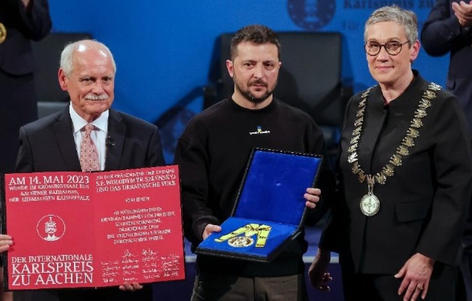 «Η Ουκρανία αγωνίζεται για την ελευθερία στην Ευρώπη», τόνισε κατ' επανάληψη ο πρόεδρος της Ουκρανίας Βολοντίμιρ Ζελένσκι παραλαμβάνοντας νωρίτερα απόψε το βραβείο «Καρλομάγνος», αφιερωμένο στην ενότητα της Ευρώπης. «Η Ευρώπη οφείλει πολλά στον ουκρανικό λαό και προσωπικά στον πρόεδρο Βολοντίμιρ Ζελένσκι. Είμαστε ενωμένοι, ανήκουμε ο ένας στον άλλον και η ιστορία μας θα συνεχιστεί από κοινού», δήλωσε ο καγκελάριος Όλαφ Σολτς, παρουσιάζοντας το τιμώμενο πρόσωπο στην τελετή που πραγματοποιήθηκε στο δημαρχείο του 'Ααχεν.
