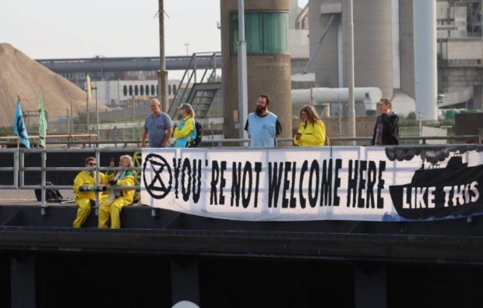 «Το πετρέλαιο σκοτώνει, σταματήστε τα κρουαζιερόπλοια» είχαν γράψει οι ακτιβιστές σε πανό που κρέμασαν στον υδατοφράκτη, στις πύλες του οποίου δέθηκαν το πρωί, σύμφωνα με τα πλάνα που μεταδίδονταν απευθείας στο διαδίκτυο.