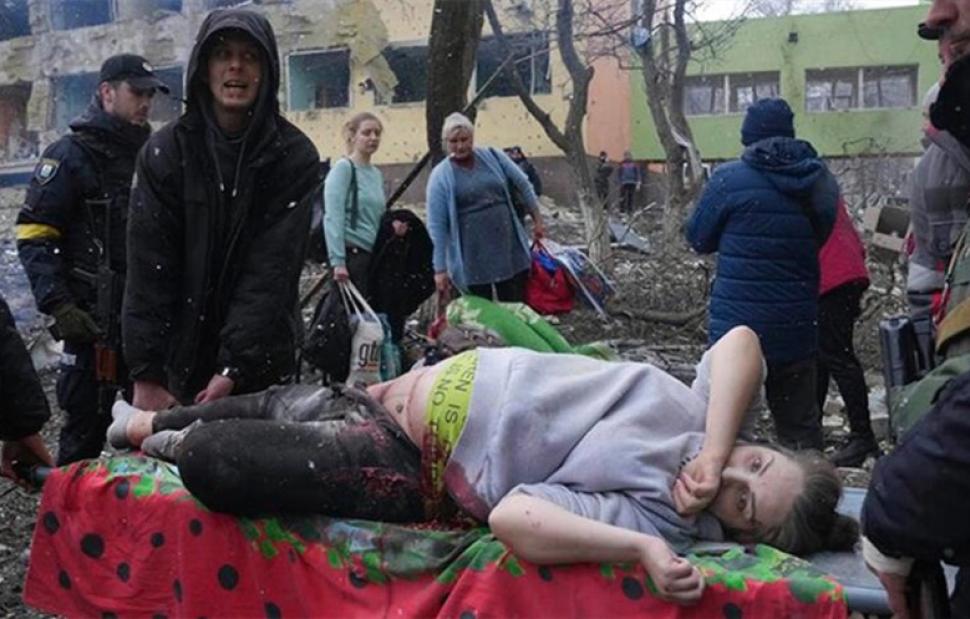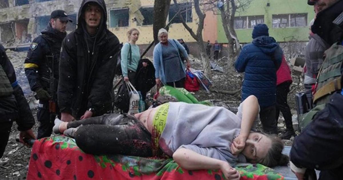 Στις εικόνες που κατέγραψαν διεθνή πρακτορεία, η γυναίκα εμφανίζεται να κρατά το ματωμένο κάτω μέρος της κοιλιάς της, καθώς οι διασώστες την απομακρύνουν από τα ερείπια έβγαζαν από τα ερείπια στην πολιορκημένη πόλη της Μαριούπολης.