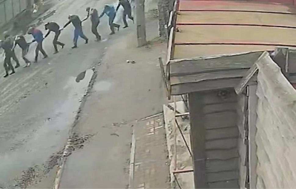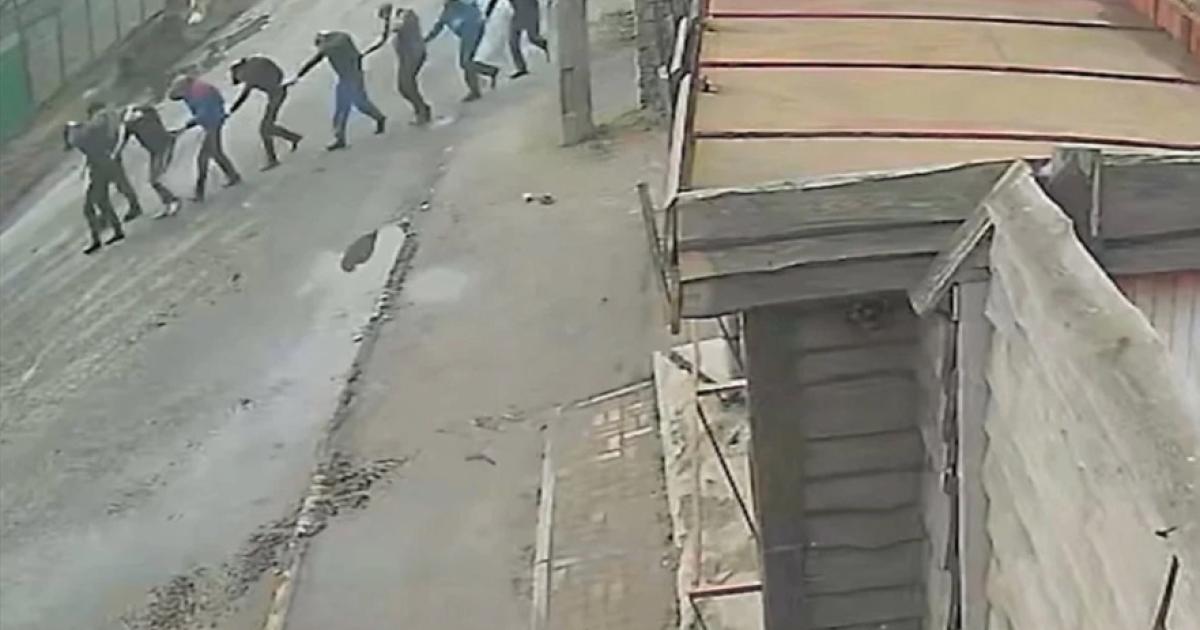 Βίντεο που κατέγραψε κάμερα ασφαλείας και βρέθηκε στην κατοχή της αμερικανικής εφημερίδας δείχνει Ρώσους στρατιώτες να οδηγούν μια ομάδα Ουκρανών αιχμαλώτων προς μία αυλή, όπου λίγες στιγμές αργότερα θα εκτελούνταν.