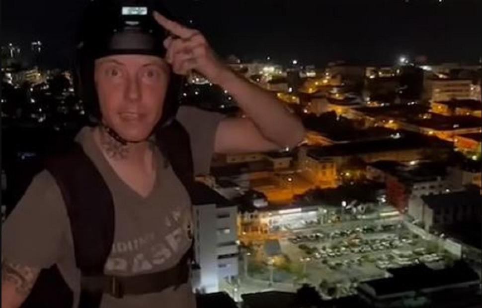 Τρομακτικά πλάνα δείχνουν τον αυτοαποκαλούμενο «junkie της αδρεναλίνης» Nathy Odinson να μετράει αντίστροφα «τρία, δύο, ένα, τα λέμε» πριν πηδήξει στο κενό. Στη συνέχεια το μικρό αλεξίπτωτό του πετάγεται στον αέρα.