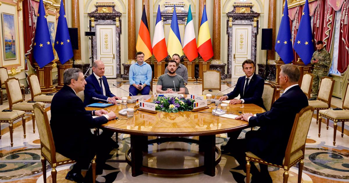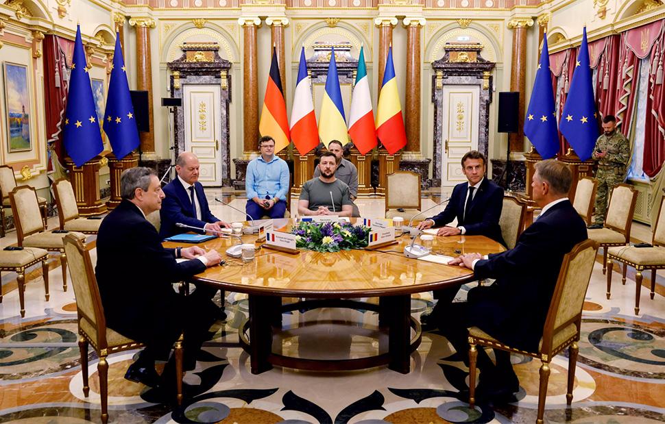 Οι Ντράγκι, Μακρόν, Σολτς και ο πρόεδρος της Ρουμανίας, Κλάους Γιοχάνις έφθασαν στο Μέγαρο Μαριίνσκι, στο κέντρο του Κιέβου, όπου τους υποδέχθηκε ο πρόεδρος της Ουκρανίας Βολοντίμιρ Ζελένσκι, αφού πρώτα επισκέφτηκαν το κατεστραμμένο από τους Ρώσους Ιρπίν.