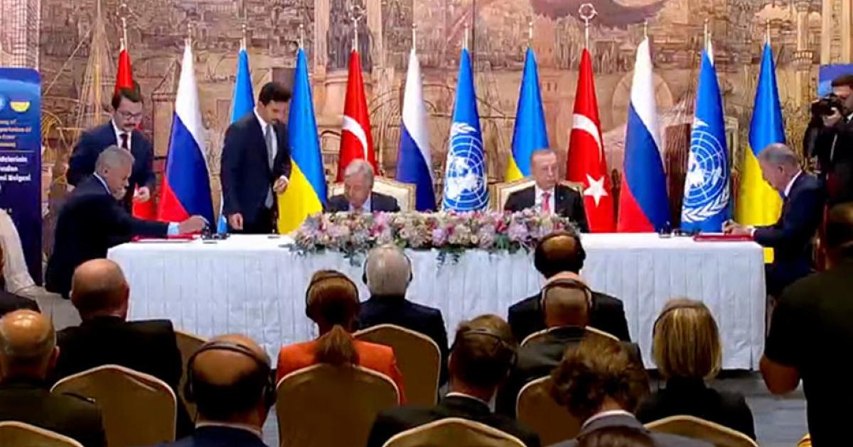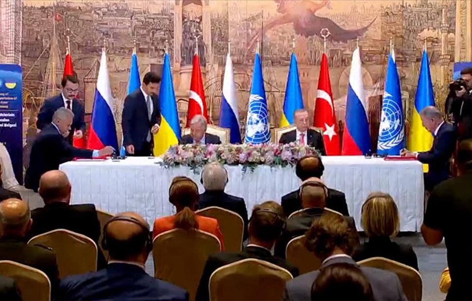 Η συμφωνία αφορά την εξαγωγή σιτηρών από τα λιμάνια της Μαύρης Θάλασσας με τον Γενικό Γραμματέα του ΟΗΕ Αντόνιο Γκουτέρες και τον Τούρκο πρόεδρο Ταγίπ Ερντογάν να σημειώνουν ότι η κίνηση αυτή θα βοηθήσει στην ανακούφιση της παγκόσμιας επισιτιστικής κρίσης.
