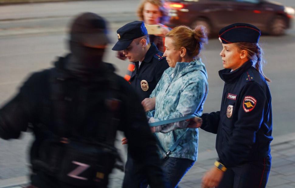 Πλάνα από την ίδια διαδήλωση εμφάνιζαν Ρώσους αστυνομικούς να μεταφέρουν άνδρες και να οδηγούν γυναίκες σε βαν της αστυνομίας.