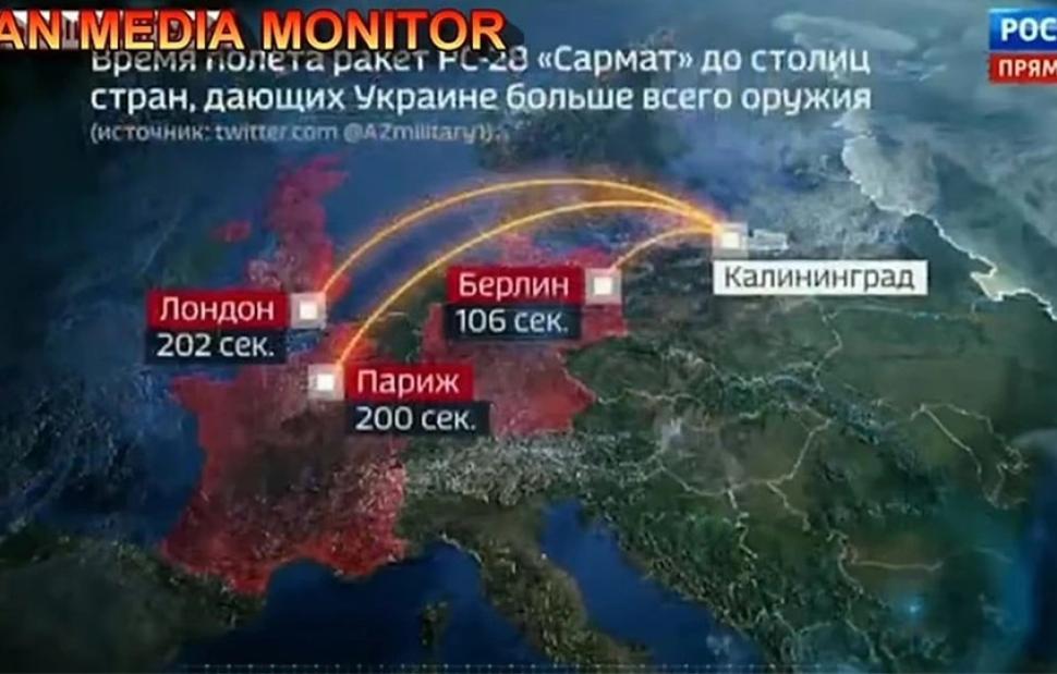 Προσομοίωση πυρηνικής επίθεσης έκανε δημοφιλής εκπομπή της ρωσικής, κατά την διάρκεια της οποία προβλήθηκε γραφικό σύμφωνα με το οποίο ένας πυραυλος που θα εκτοξευθεί από το Καλίνινγκραντ, στη Βαλτική Θάλασσα, θα έχει φτάσει σε 106 δευτερόλεπτα στο Βερολίνο, σε 200 δευτερόλεπτα στο Παρίσι και σε 202 δευτερόλεπτα στο Λονδίνο!