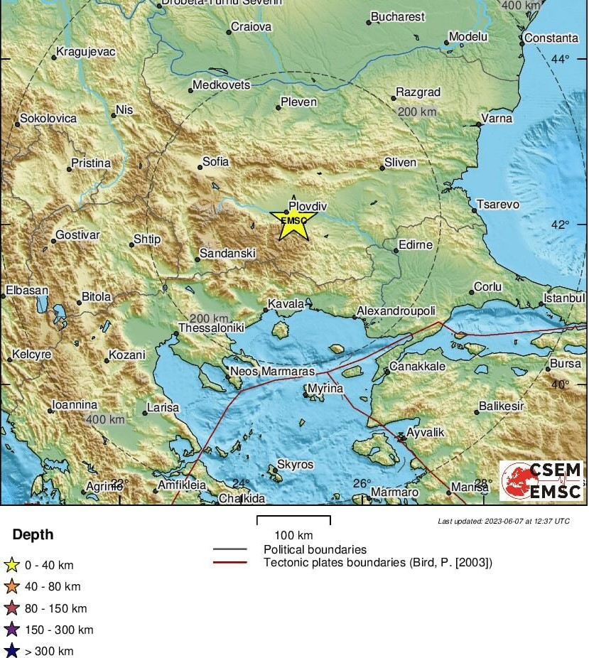 Σύμφωνα με το Ευρωμεσογειακό Σεισμολογικό Κέντρο, το επίκεντρο του σεισμού εντοπίζεται 15 χιλιόμετρα βορειοανατολικά της Φιλιππούπολης και 146 χλμ ανατολικά-βορειοανατολικά της Σόφιας. Το εστιακό βάθος υπολογίζεται στα 2 χιλιόμετρα.