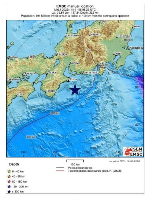 6️⃣1️⃣ 🟠 M 6.1, 14/11 08:08 (UTC), depth 356 Km, Near South Coast of Honshu, Japan.