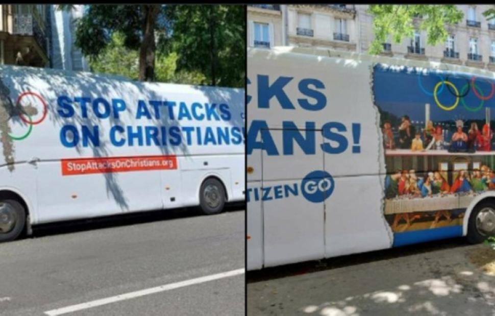 Με αφορμή αυτό λοιπόν, μια ομάδα ακτιβιστών από την Ισπανία «έντυσε» ένα λεωφορείο στα χρώματα των Ολυμπιακών Αγώνων και των Ολυμπιακών κύκλων το οποίο και κυκλοφόρησαν στους δρόμους του Παρισιού, βάζοντας από τη μια πλευρά μια εικόνα από την Τελετή Έναρξης των Αγώνων και μία από τον «Μυστικό Δείπνο». Από την άλλη πλευρά του οχήματος, υπήρχε ένας μεγάλος σταυρός και η επιγραφή: «Σταματήστε τις επιθέσεις σε Χριστιανούς».