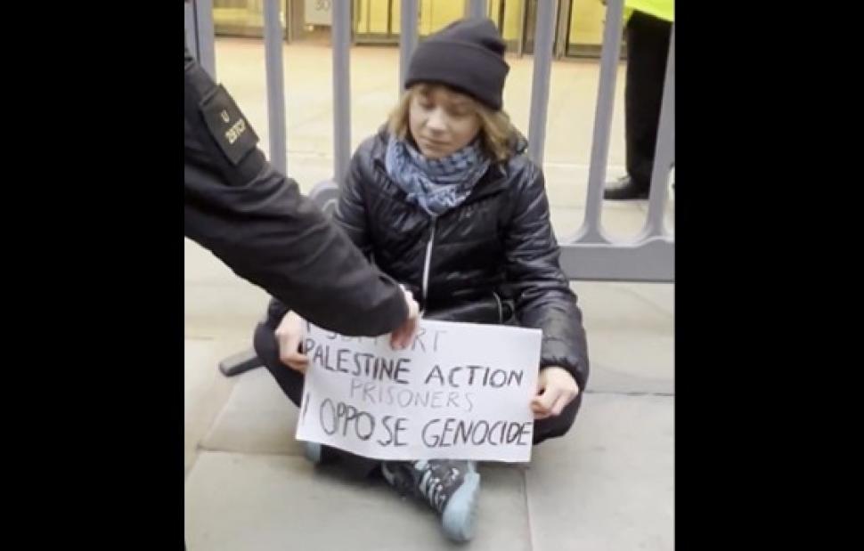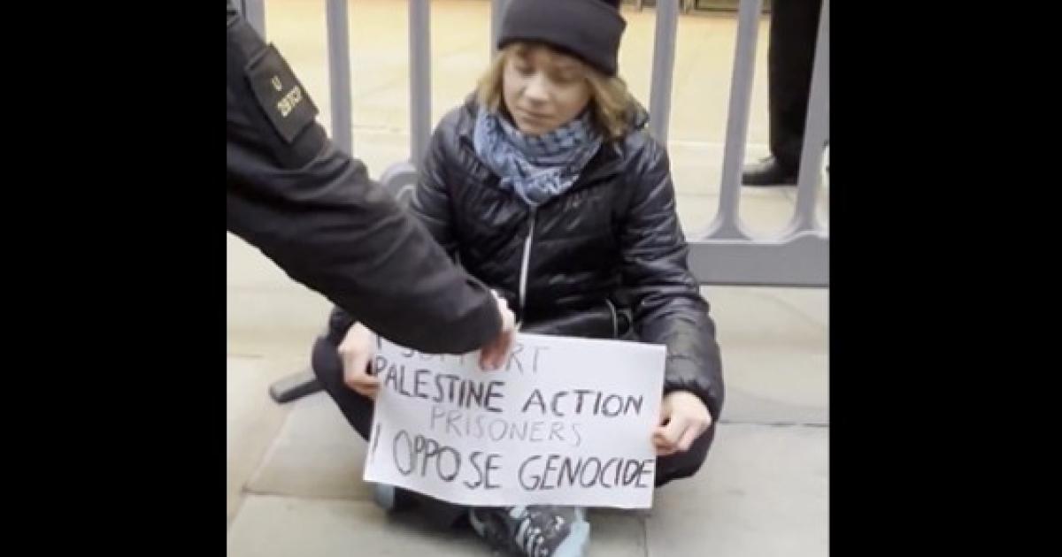 Η γνωστή ακτιβίστρια συμμετείχε στη διαμαρτυρία κρατώντας πλακάτ υποστήριξης της ομάδας Prisoners for Palestine και των απεργών πείνας που συνδέονται με την οργάνωση Palestine Action.
