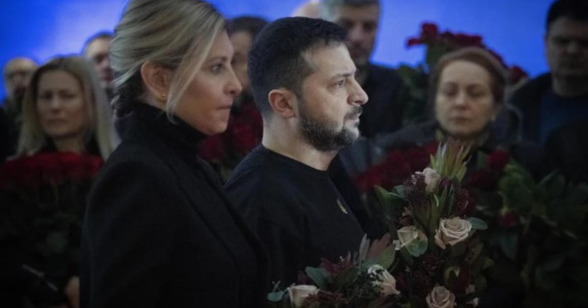 Κατά τη θλιβερή τελετή στο Κίεβο, ο Ζελένσκι και η σύζυγός του κατέθεσαν λουλούδια σε καθένα από τα επτά φέρετρα που ήταν σκεπασμένα με τις μπλε και κίτρινες σημαίες της Ουκρανίας. Στη συνέχεια ο Ζελένσκι μίλησε για λίγο με τις οικογένειες, ενώ μια μικρή ορχήστρα έπαιζε ένα πένθιμο τραγούδι.