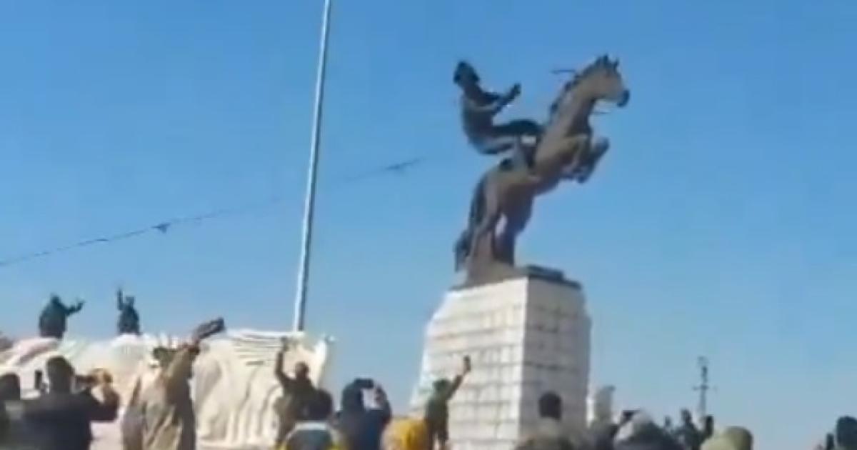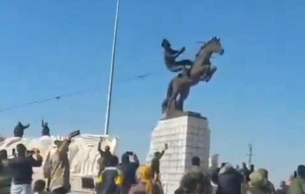 Turkey backed rebels topple the statue of Bassel al-Assad, the deceased brother of pro- Iran President of Syria Bashar al Assad in the city of Aleppo. #BREAKING #Syria #Iran #Turkiye pic.twitter.com/V6U7KhJbTs
