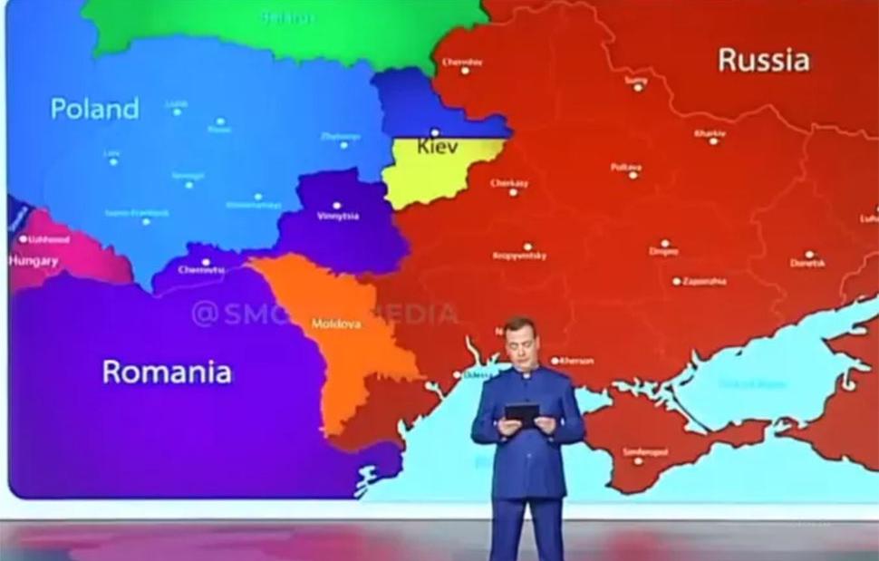 Σε δημόσια διάλεξή του ο Μεντβέντεφ εξαφάνισε σχεδόν όλη την Ουκρανία από το χάρτη (με εξαίρεση το Κίεβο) προσθέτοντας ότι οι αμερικανικές ειδικές δυνάμεις και στρατιωτικοί σύμβουλοι ήδη διεξάγουν πόλεμο στη Ρωσία.
