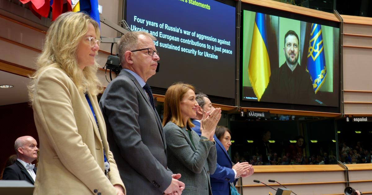 Την Τρίτη, ο πρόεδρος της Ουκρανίας, Βολοντίμιρ Ζελένσκι, απευθύνθηκε στους ευρωβουλευτές σε έκτακτη σύνοδο ολομέλειας για την τέταρτη επέτειο της πλήρους επίθεσης της Ρωσίας.