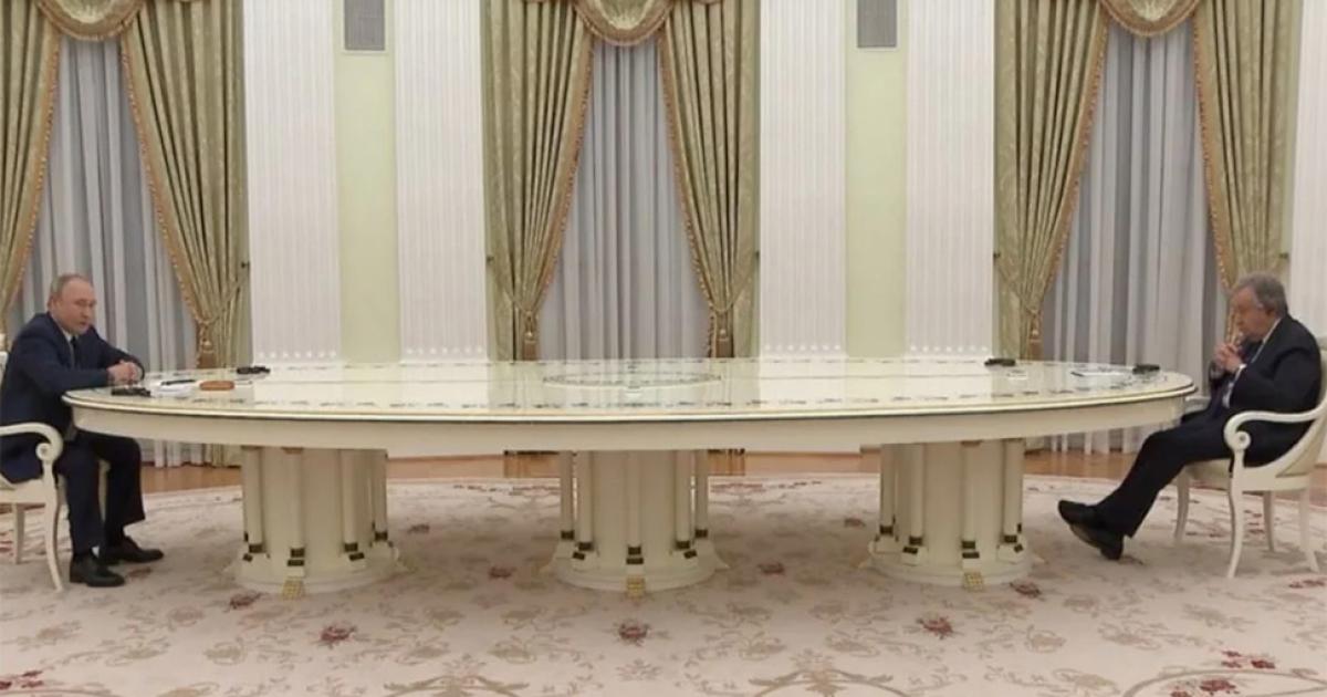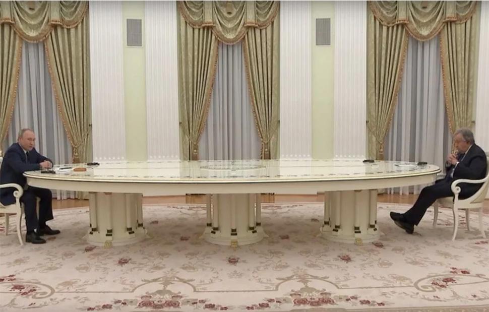 Τώρα, ήρθε η σειρά του γενικού γραμματέα του ΟΗΕ, Αντόνιο Γκουτέρες, να συνομιλήσει με τον Ρώσο πρόεδρο από απόσταση 6 μέτρων. Γκουτέρες και Πούτιν συναντήθηκαν σήμερα, Τρίτη 26 Απριλίου στη Μόσχα, εν μέσω αυξανόμενων φόβων για μια κλιμάκωση του πολέμου και εκτός των ουκρανικών συνόρων, καθώς σημειώθηκαν εκρήξεις στην αποσχισθείσα περιοχή Υπερδνειστερία, που βρίσκεται στη Μολδαβία. Για τις εκρήξεις αλληλοκατηγορούνται οι διάφορες εμπλεκόμενες πλευρές.