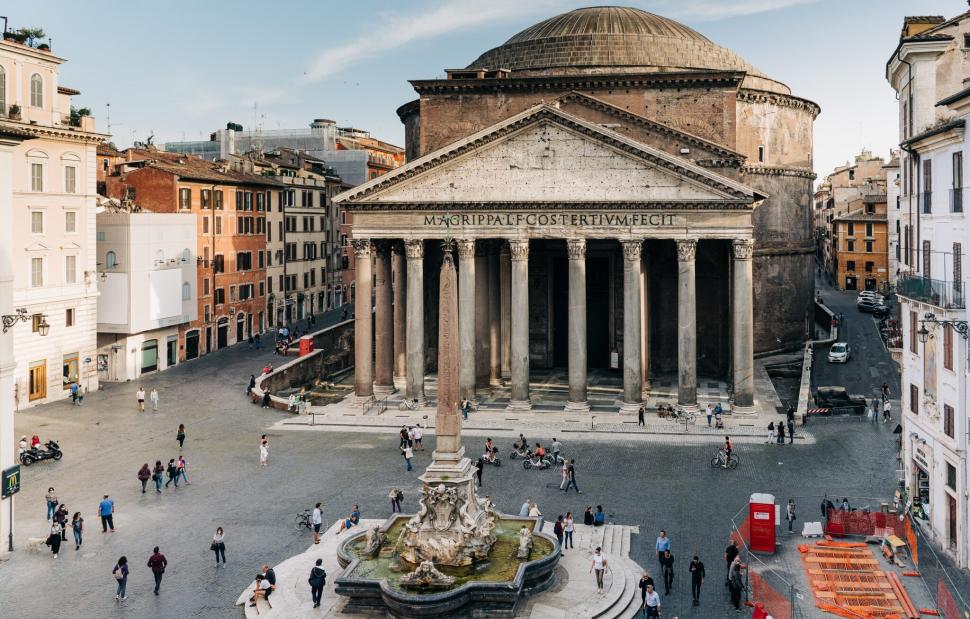 Η περιοχή γύρω από τον εξωτερικό τοίχο του Πάνθεον είναι ιδιαίτερα πολυσύχναστη από τουρίστες που σταματούν για να ξεκουραστούν ή να τραβήξουν φωτογραφίες. Το Πάνθεον, που κατασκευάστηκε από τον Ρωμαίο αυτοκράτορα Αδριανό και είναι γνωστό για τον επιβλητικό θόλο του με το χαρακτηριστικό άνοιγμα, παραμένει ένα από τα πιο επισκέψιμα μνημεία της Ιταλίας.
