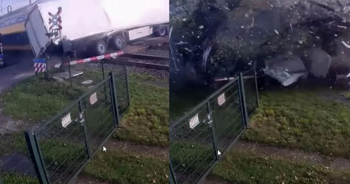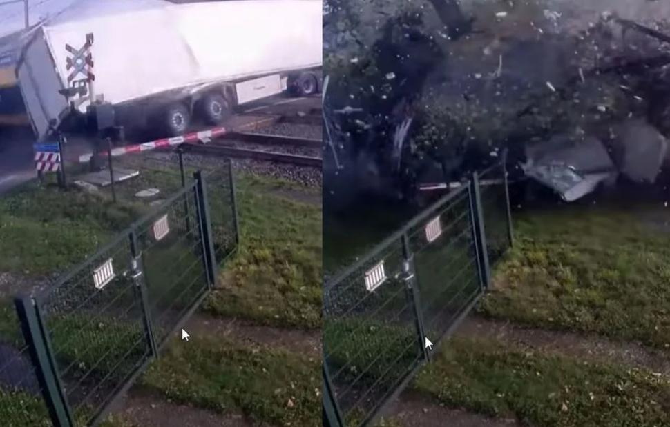 Τη σφοδρή σύγκρουση ενός τρένου υψηλής ταχύτητας με ένα φορτηγό σε ισόπεδη διάβαση κατέγραψε κάμερα κλειστού κυκλώματος στην Ολλανδία. Στις εικόνες διακρίνεται ο οδηγός του φορτηγού να κάνει όπισθεν, καθώς κλείνουν οι μπάρες στο χωριό Μέτερεν στην κεντρική Ολλανδία με αποτέλεσμα να πέσει πάνω του με ορμή το τρένο που μετέφερε εκατοντάδες επιβάτες και να τραυματιστούν πέντε άτομα που επέβαιναν στη νταλίκα.