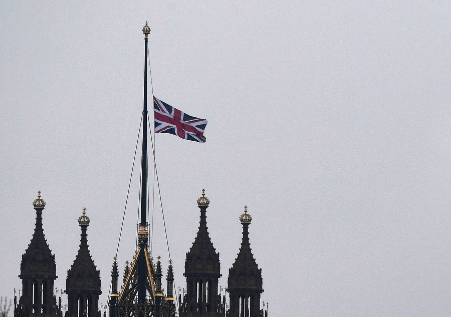 Την ίδια στιγμή η σημαία του Ηνωμένου Βασιλείου πνέει μεσίστια στο κοινοβούλιο στο κέντρο του Λονδίνου.