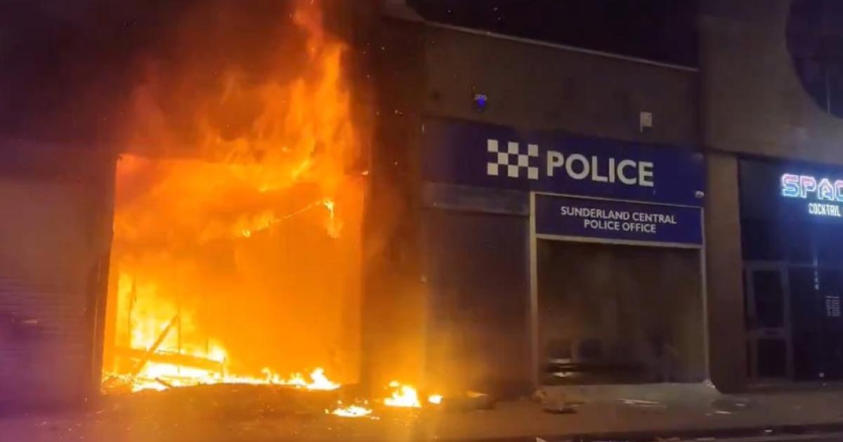 Το αστυνομικό τμήμα του Σάντερλαντ στο Waterloo Place λεηλατήθηκε και πυρπολήθηκε. Η Αστυνομία που αντιμετωπίζει τις ταραχές στο Σάντερλαντ υφίσταται «σοβαρή βία», ανέφεραν οι αστυνομικές Αρχές της Νορθούμπρια.
