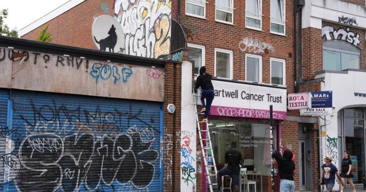 Η σιλουέτα ενός λύκου που ουρλιάζει, ζωγραφισμένη σε ένα δορυφορικό πιάτο στην επίπεδη οροφή ενός καλυμμένου με γκράφιτι κλειστού κτιρίου στην Ράι Λέιν, στο Πέκαμ, στο νοτιοανατολικό Λονδίνο, αποκαλύφθηκε την Πέμπτη (8/8) - η τέταρτη σε μια σειρά από εικόνες ζώων που έχουν εμφανιστεί σε όλο το Λονδίνο αυτή την εβδομάδα.