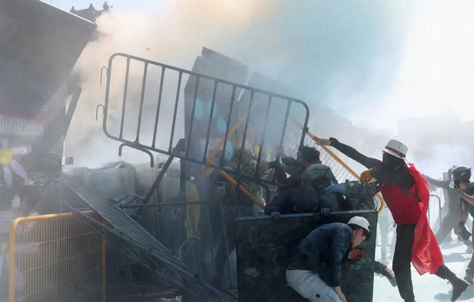Κατά την άφιξη των διαδηλωτών έξω από το προεδρικό μέγαρο, ορισμένοι κουκουλοφόροι έριξαν τα μεταλλικά φράγματα που είχε τοποθετήσει η αστυνομία γύρω από αυτό και επιτέθηκαν με πέτρες στους αστυνομικούς. Οι δυνάμεις ασφαλείας έκαναν χρήση δακρυγόνων για να απωθήσουν το πλήθος.