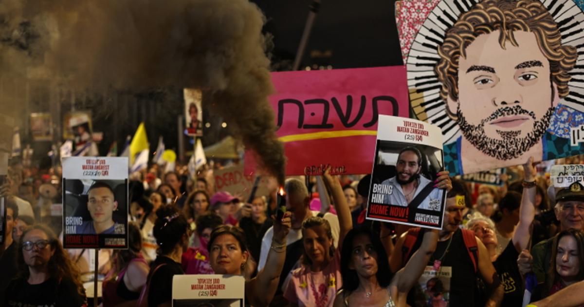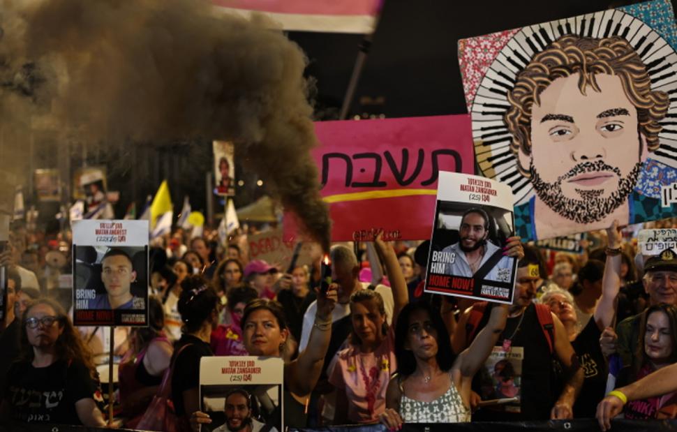 «Αύριο θα οδηγήσουμε τη χώρα σε πάγωμα», δήλωσε απευθυνόμενη στους διαδηλωτές η Εϊνάβ Ζανγκάουκερ, ο γιος της οποίας, ο Ματάν, είναι ένας από τους περίπου 20 ζωντανούς ομήρους που εξακολουθούν να κρατούνται στη Λωρίδα της Γάζας. Η Ζανγκάουκερ αναφερόταν σε προγραμματισμένη για σήμερα πανεθνική απεργία στο Ισραήλ.