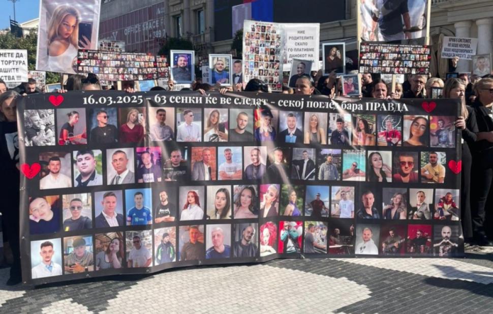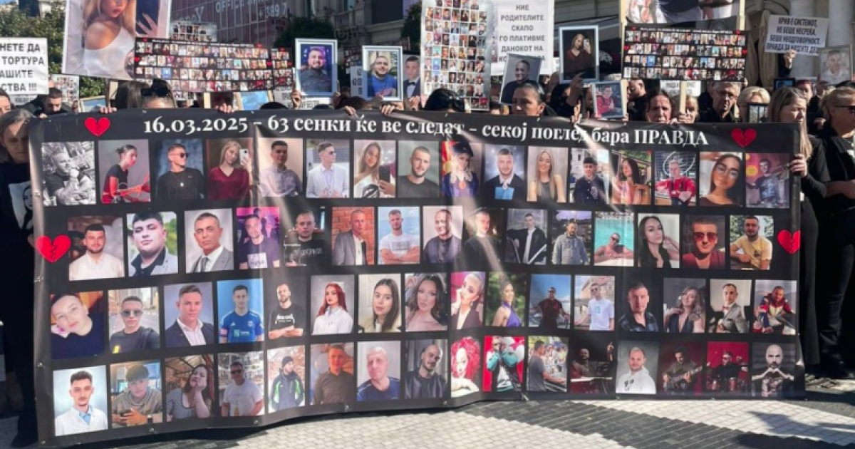 Η σημερινή πορεία στα Σκόπια ξεκίνησε από την κεντρική πλατεία και, περνώντας μπροστά από το Κοινοβούλιο, κατέληξε στο Δικαστικό Μέγαρο. Επικεφαλής βρίσκονταν οι συγγενείς των θυμάτων, κρατώντας ένα μεγάλο πανό με τα πρόσωπα των 63 νεκρών. Στην κορυφή του πανό αναγραφόταν: «63 σκιές θα σας ακολουθούν — κάθε βλέμμα ζητά δικαιοσύνη».
