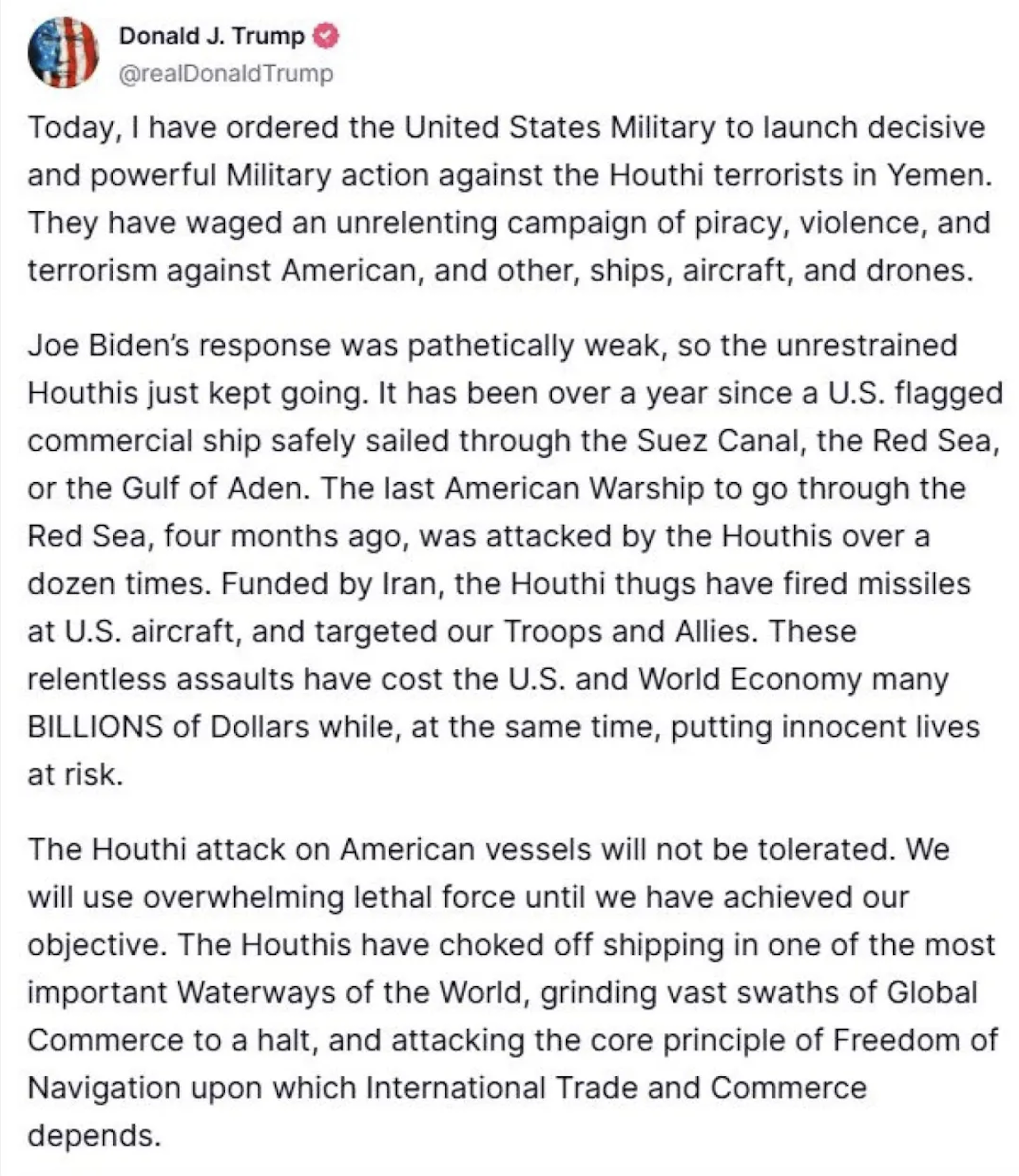Η επίθεση των Χούθι σε αμερικανικά πλοία δεν θα γίνει ανεκτή. Θα χρησιμοποιήσουμε συντριπτική δύναμη μέχρι να επιτύχουμε τον στόχο μας. Οι Χούθι έχουν αποκλείσει τη ναυσιπλοΐα σε μία από τις σημαντικότερες πλωτές οδούς του κόσμου, σταματώντας τεράστια τμήματα του παγκόσμιου εμπορίου και επιτιθέμενοι στη βασική αρχή της ελευθερίας της ναυσιπλοΐας από την οποία εξαρτάται το διεθνές εμπόριο.