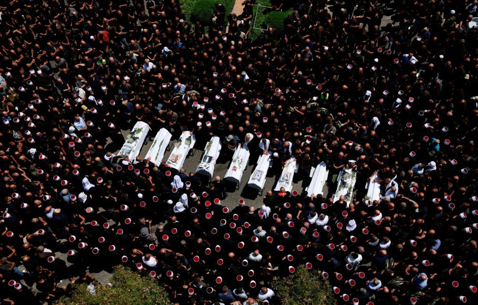 Χιλιάδες άνθρωποι από την κοινότητα των Δρούζων έχουν συγκεντρωθεί για τις κηδείες. Άνδρες, ντυμένοι με παραδοσιακά ρούχα, μετέφεραν τα σκεπασμένα με λευκά σκεπάσματα φέρετρα στους δρόμους του Majdal Shams, όπου συνέβη το χτύπημα.