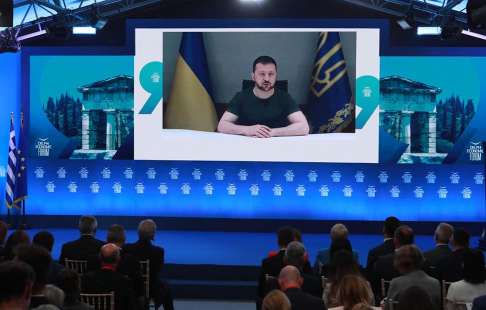 Στις επισκέψεις του Κυριάκου Μητσοτάκη και της Κατερίνας Σακελλαροπούλου στην Ουκρανία αναφέρθηκε στον χαιρετισμό του στο Οικονομικό Φόρουμ των Δελφών ο πρόεδρος της Ουκρανίας, Βολοντιμίρ Ζελένσκι, ο οποίος τόνισε ότι «ο Βλαντιμίρ Πούτιν πρέπει να χάσει».