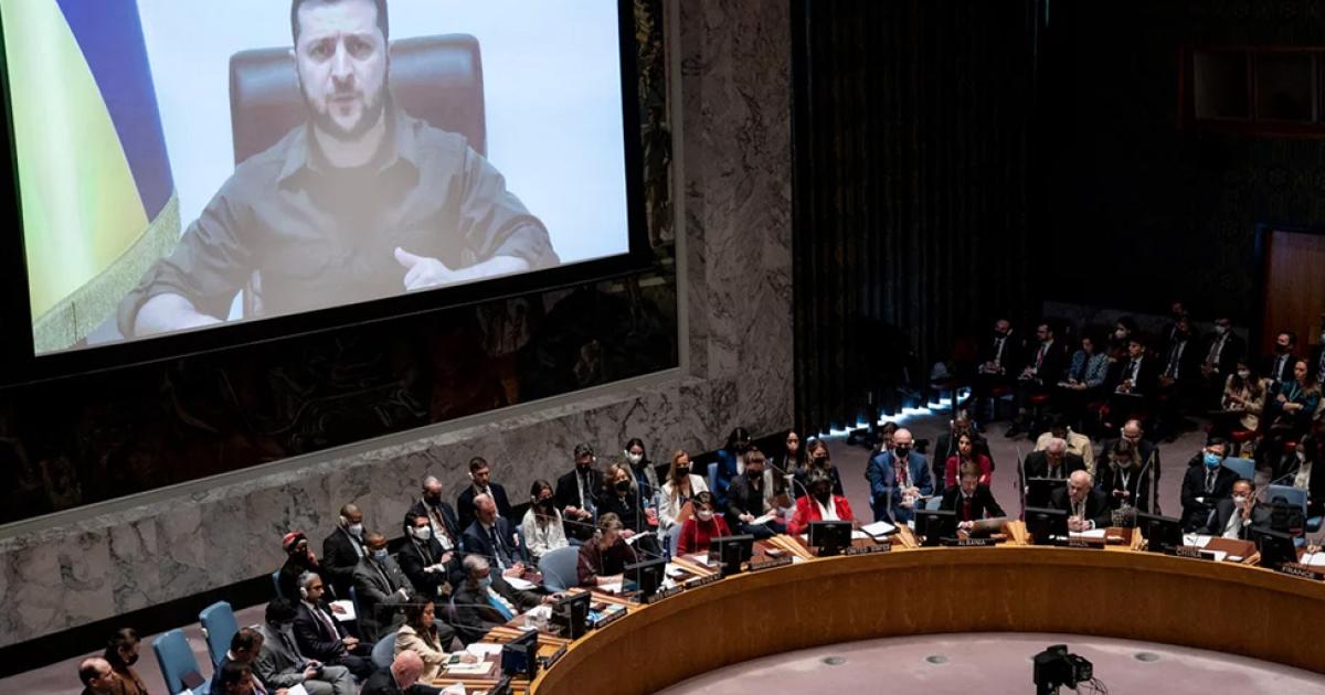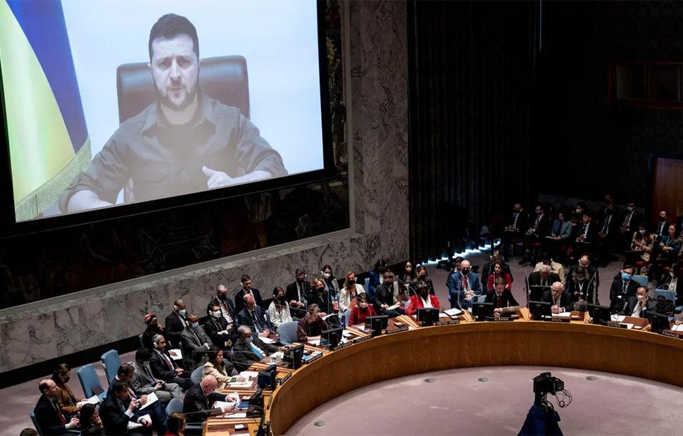 Δριμύ κατηγορώ εναντίον της Ρωσίας εξαπέλυσε ο Ουκρανός πρόεδρος Βολοντίμιρ Ζελένσκι από το βήμα του Συμβουλίου Ασφαλείας του ΟΗΕ, απ' όπου μέσω βιντεοκλήσης παρουσίασε καταστάσεις αδιανόητης βίας από το ρωσικό στρατό, λέγοντας ότι «δεν υπάρχει έγκλημα που να μην το έχουν διαπράξει».