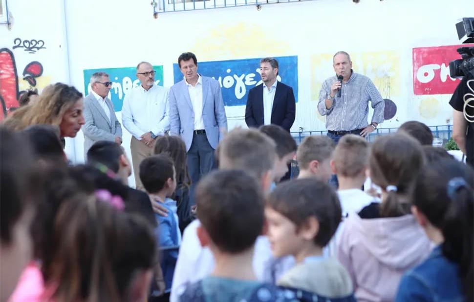 Μετά τον αγιασμό, ο πρόεδρος του ΠΑΣΟΚ-ΚΙΝΑΛ χαιρέτισε μαθητές και γονείς και στη συνέχεια συναντήθηκε με τους δασκάλους, οι οποίοι τον ενημέρωσαν για θέματα του σχολείου.