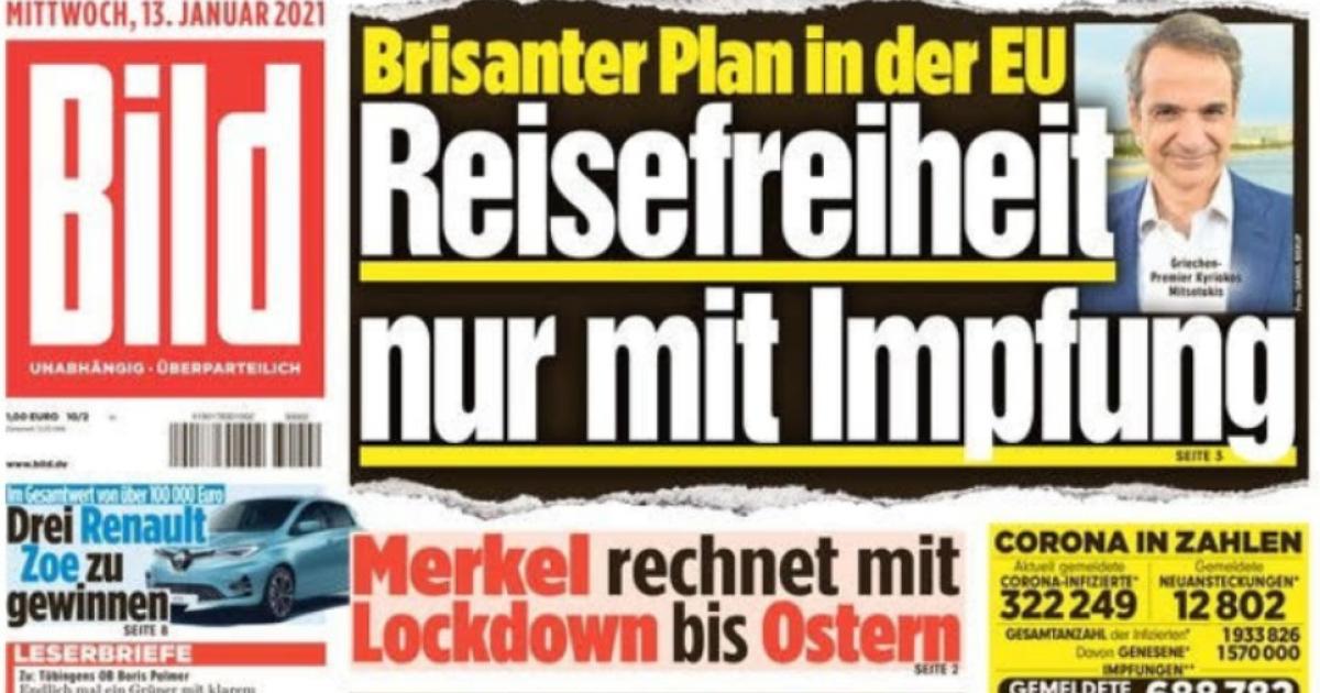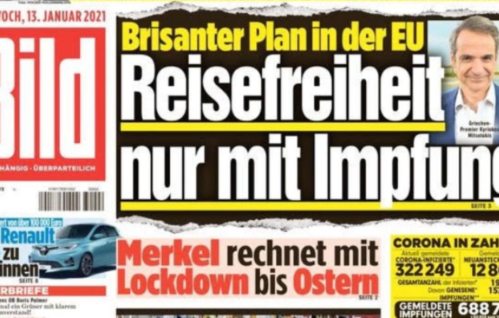 Το δημοσίευμα της Bild έχει τίτλο «Εντυπωσιακό σχέδιο στην Ευρωπαϊκή Ένωση. Ελευθερία στα ταξίδια με εμβολιασμό. Πρόταση του Έλληνα Πρωθυπουργού – Θα γίνει η κάρτα εμβολιασμού το νέο διαβατήριο;» και αναφέρεται στην πρόταση που βρίσκεται στο τραπέζι της Κομισιόν και θέλει το Πιστοποιητικό Εμβολιασμού για τον κορωνοϊό να είναι το «εισιτήριο εισόδου» για ταξιδιώτες στα σύνορα της Ευρώπης.