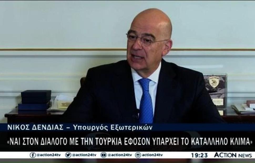 Μιλώντας στο Action 24, ο Νίκος Δένδιας σπεύδει να χαρακτηρίσει «απολύτως καλοδεχούμενη» την «τεράστια αλλαγή», όπως αναφέρει, της τουρκικής στάσης έναντι της Ελλάδας. Ερωτηθείς αν εμπιστεύεται τη στροφή αυτή της Τουρκίας, ο υπουργός Εξωτερικών απαντά ότι η εμπιστοσύνη αναπτύσσεται με τον καιρό και σημειώνει πως δεν είναι η ελληνική πλευρά η οποία είχε εκφράσει απειλές ή διεκδικήσεις.