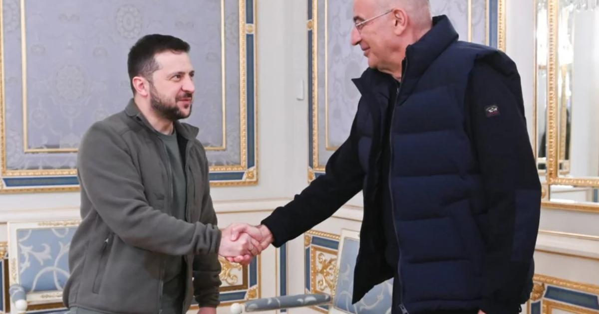 Ο Νίκος Δένδιας έγινε δεκτός από τον Βολοντιμίρ Ζελένσκι, και υπογράμμισε ότι η Ελλάδα συνεχίζει να στηρίζει την Ουκρανία και «καταδικάζει πλήρως κάθε απόπειρα αλλαγής συνόρων από δυνάμεις του αναθεωρητισμού».
