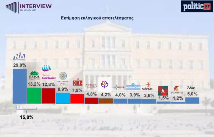 Πρώτη, κερδίζοντας 2 μονάδες σε σχέση με την αμέσως προηγούμενη έρευνά, παραμένει σταθερά η Νέα Δημοκρατία, σύμφωνα με δημοσκόπηση της Interview για την ιστοσελίδα politic.gr.