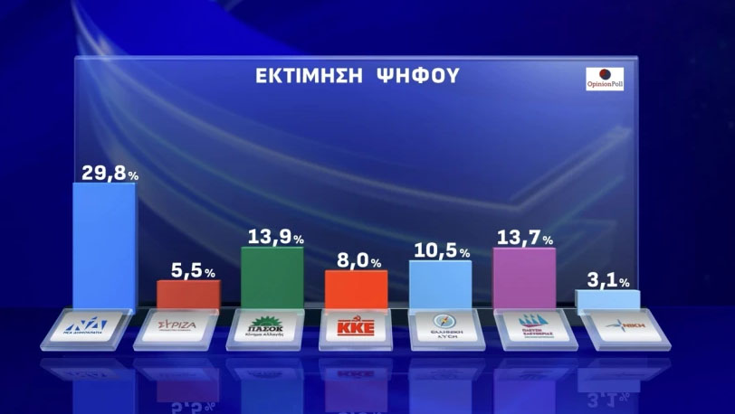 Στις 15,9 μονάδες προσδιορίζει η Opinion Poll το προβάδισμα της ΝΔ στην εκτίμηση ψήφου, στη μέτρηση που παρουσιάστηκε στο κεντρικό δελτίο του Action 24. Το ΠΑΣΟΚ κερδίζει μισή μονάδα σε σχέση με την έρευνα του Μαΐου και επιστρέφει στην δεύτερη θέση, καθώς η Πλεύση Ελευθερίας εμφανίζει απώλειες 2,3 μονάδων.