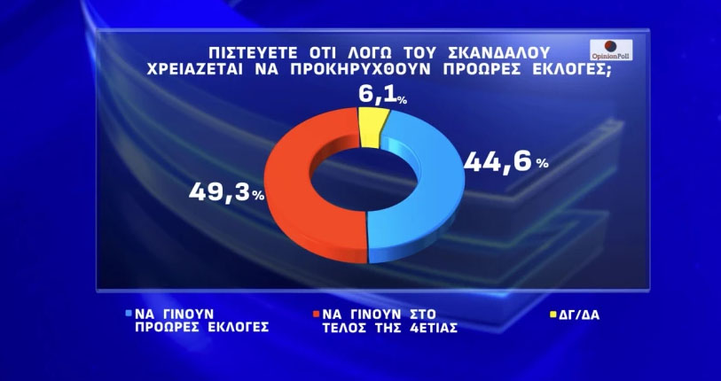 Όσον αφορά στο αίτημα για πρόωρες εκλογές, το 49.3% τάσσεται υπέρ εκλογών στο τέλος της 4ετίας και το 44.6% υπέρ. Σημειώνεται ότι πλειοψηφικά ενάντια σε πρόωρες εκλογές τάσσονται οι ψηφοφόροι της Ν.Δ με 77.4% και το ΠΑΣΟΚ με 53.1%. Σε όλα τα άλλα κομματικά ακροατήρια η άποψη για πρόωρες εκλογές είναι πλειοψηφική.
