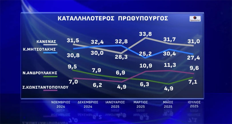 Στην καταλληλότητα για Πρωθυπουργός ο Κ. Μητσοτάκης προηγείται με μεγάλη διαφορά επιλεγόμενος από το 27.4% έναντι 9.6% της Ζωής Κωνσταντοπούλου, 7.1% του Ν. Ανδρουλάκη, 6.1% του Κ. Βελόπουλου και ακολουθούν με μικρότερες επιδόσεις οι υπόλοιποι Πολιτικοί Αρχηγοί.