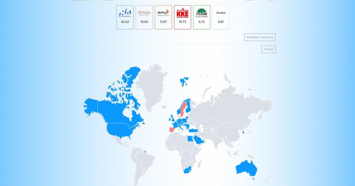 Η Νέα Δημοκρατία συγκέντρωσε πάνω από 50% σε οκτώ χώρες: ΗΠΑ, Καναδά, Αυστραλία, Σαουδική Αραβία, Τουρκία, Βουλγαρία, Ρουμανία και Λιθουανία.