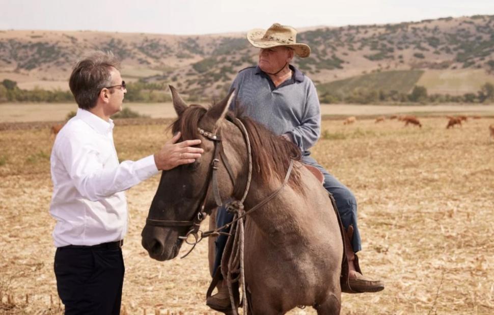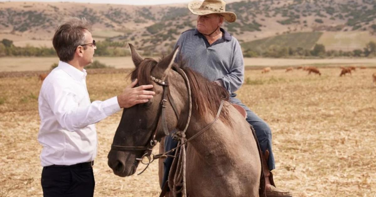 Σε μία από τις φωτογραφίες που κάνουν τον γύρο του διαδικτύου ο Πρωθυπουργός χαιρετά έναν κτηνοτρόφο που βρίσκεται πάνω σε άλογο και έχει μια χαλαρή κουβέντα μαζί του για τα προβλήματα του κλάδου.