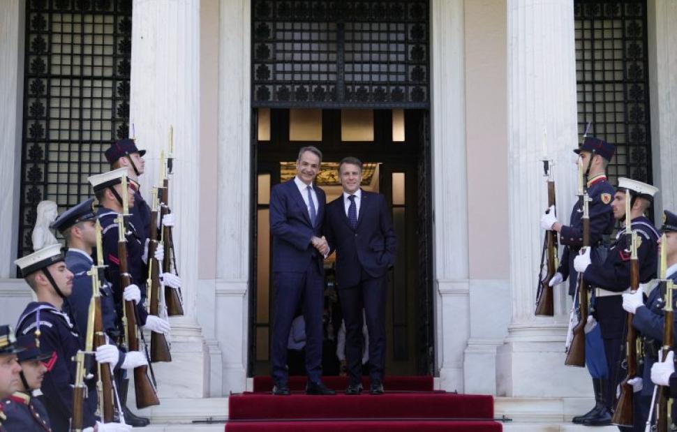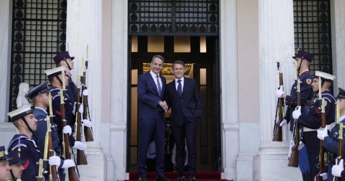 Οι δύο ηγέτες επιθεώρησαν το άγημα, ενώ ακούστηκαν οι εθνικοί ύμνοι Ελλάδας και Γαλλίας. Την ίδια στιγμή, γαλλικά Rafale πετούσαν πάνω από τον αττικό ουρανό, υπενθυμίζοντας την καθοριστική ενίσχυση της ελληνικής άμυνας και από αέρος.