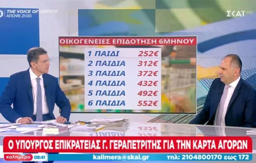 «Η φορολόγηση των υπερκερδών των διυλιστηρίων έγινε για την καταπολέμηση του πληθωρισμού» δήλωσε στον ΣΚΑΪ ο υπουργός επικρατείας Γιώργος Γεραπετρίτης, τονίζοντας ότι η κάρτα που ανακοίνωσε χθες ο πρωθυπουργός δεν θα πρέπει να λέγεται «food pass» αλλά «Κάρτα αγορών» καθώς περιλαμβάνει και προϊόντα που δεν είναι τρόφιμα, όπως πχ χαρτικά και άλλα που βρίσκουν οι καταναλωτές στα σούπερ μάρκετ.