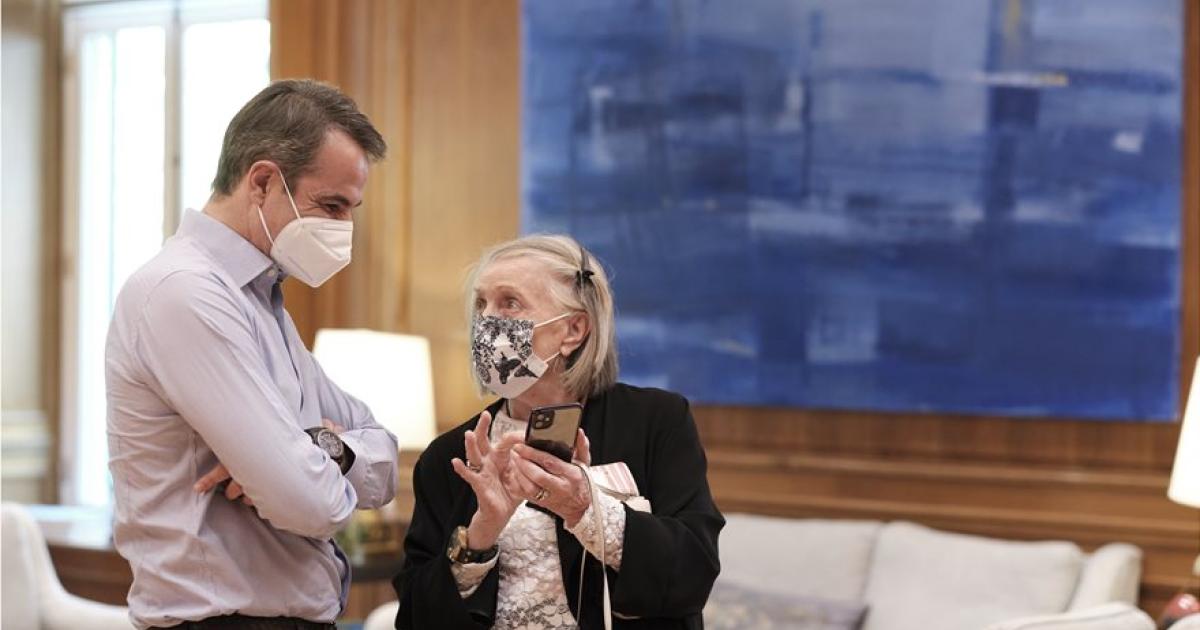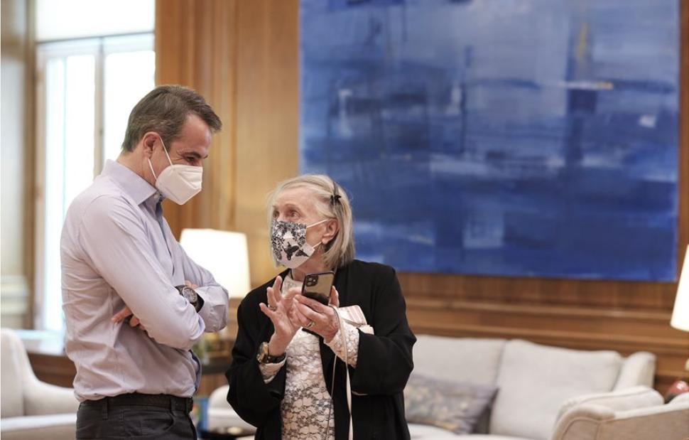 Στη συνάντηση ο Κυριάκος Μητσοτάκης συζήτησε μαζί της το θέμα του εμβολιασμού και η ίδια τον ενημέρωσε ότι έχει κάνει και τις δύο δόσεις του εμβολίου.