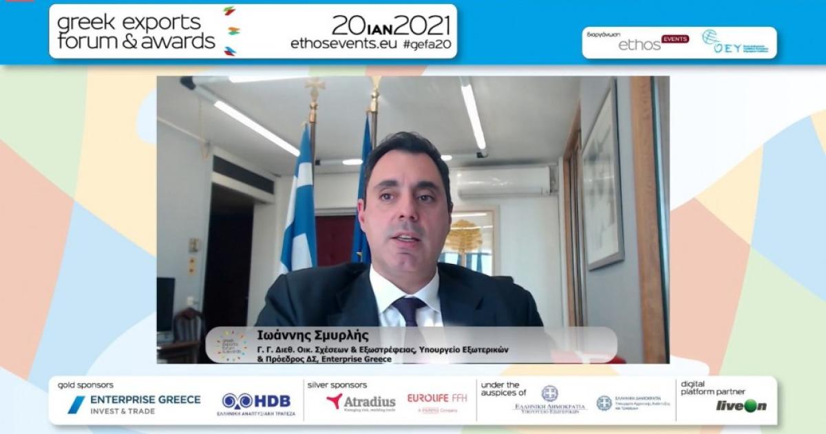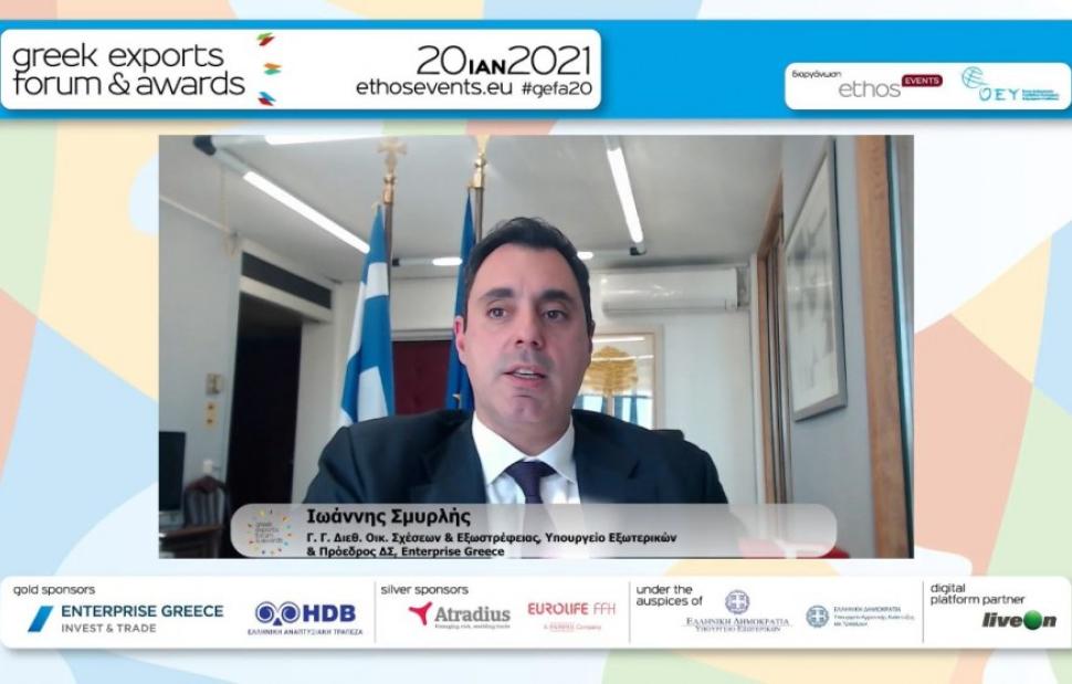 Σε χαιρετισμό που απηύθυνε στις 20 Ιανουαρίου, ο Γενικός Γραμματέας Διεθνών Οικονομικών Σχέσεων και Εξωστρέφειας του υπουργείου Εξωτερικών και Πρόεδρος της Enterprise Greece, Γιάννης Σμυρλής, στο πλαίσιο της εκδήλωσης «Greek Exports Forum and Awards 2020», με τίτλο «Η Νέα Εποχή της Ελληνικής Οικονομικής Διπλωματίας», αφού παρουσίασε συνοπτικά τον μετασχηματισμό του ΥΠΕΞ, υπό την Κυβέρνηση του Κυριάκου Μητσοτάκη, σε φορέα αποτελεσματικής προώθησης των οικονομικών συμφερόντων της Ελλάδας, με την ένταξη, σε αυτό, της Enterprise Greece, του ΟΑΕΠ και της Διεθνούς Αναπτυξιακής Συνεργασίας, εξήρε το ρόλο της στοχευμένης οικονομικής διπλωματίας.