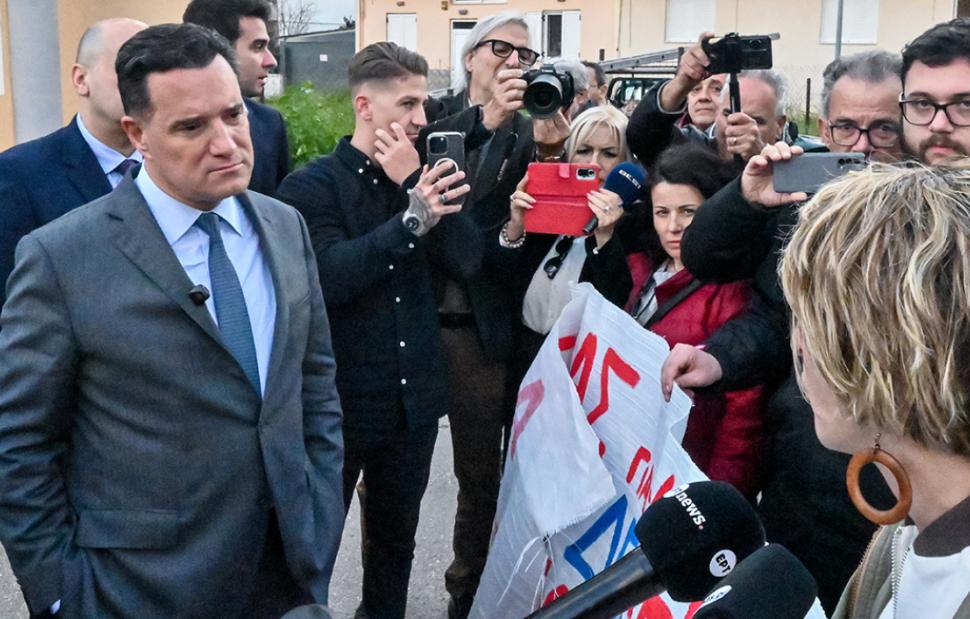 Φτάνοντας στο νοσοκομείο, ο Άδωνις Γεωργιάδης συνάντησε συγκεντρωμένους από το Σωματείο Ιδιωτικών Υπαλλήλων Αργολίδας, οι οποίοι διαμαρτύρονταν για τα εξοπλιστικά και τη φρεγάτα «Κίμων».
