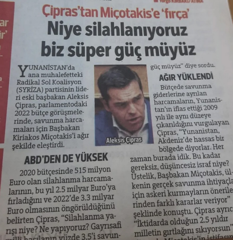 Το δημοσίευμα αναφέρει: «Ο πρώην πρωθυπουργός Αλέξης Τσίπρας, αρχηγός του κόμματος ΣΥΡΙΖΑ στην Ελλάδα, επέκρινε σφοδρά τον πρωθυπουργό Κυριάκο Μητσοτάκη για τις αμυντικές δαπάνες, κατά τη συζήτηση του προϋπολογισμού για το 2022 στο κοινοβούλιο. Οι εξοπλιστικές δαπάνες, 515 εκατ. ευρώ στον προϋπολογισμό του 2020 εκτοξεύτηκαν στα 2,5 δισ. ευρώ φέτος, προβλέπεται να φτάσουν τα 3,3 δισ. ευρώ το 2022. Ο Τσίπρας είπε: «Γιατί αυτός ο αγώνας εξοπλισμών; Γιατί το κάνουμε;»