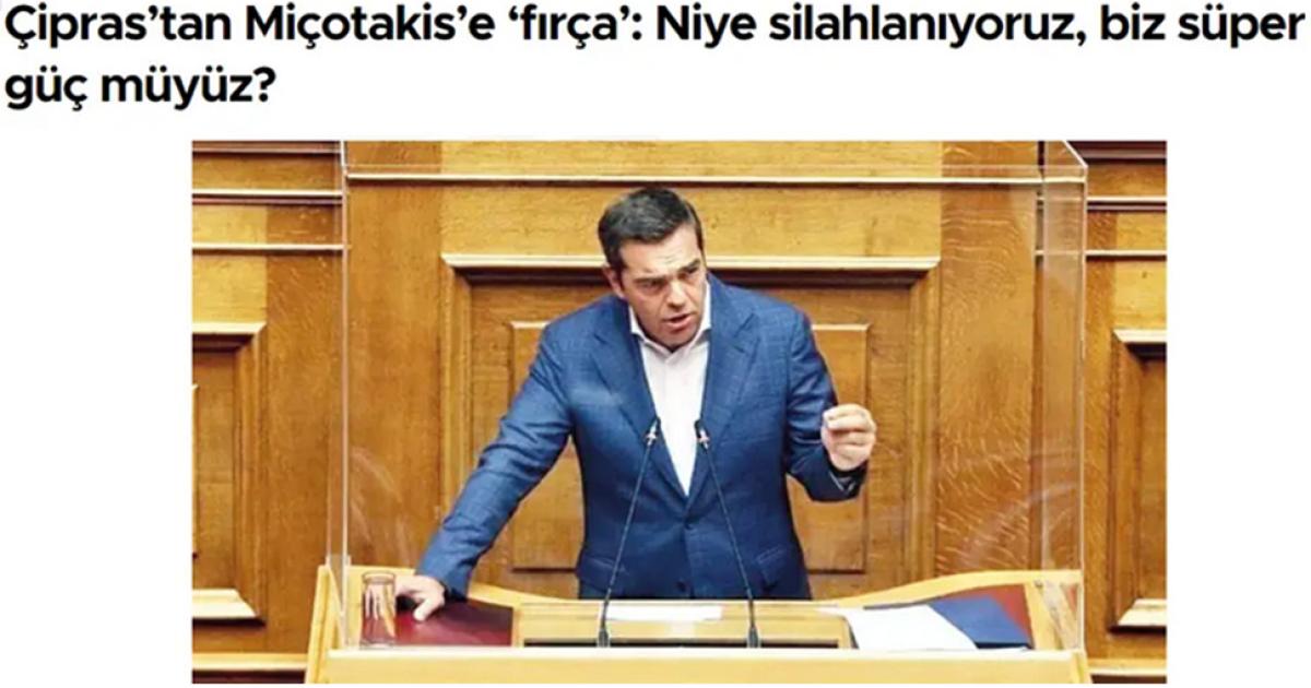 Τα όσα υποστήριξε το περασμένο Σάββατο, για «κούρσα εξοπλισμών», ο αρχηγός της αξιωματικής αντιπολίτευσης, παρουσιάζονται έντονα στην τουρκική εφημερίδα με τίτλο: «Κατηγορίες Τσίπρα προς Μητσoτάκη: Γιατί εξοπλιζόμαστε; Θα γίνουμε μήπως υπερδύναμη».